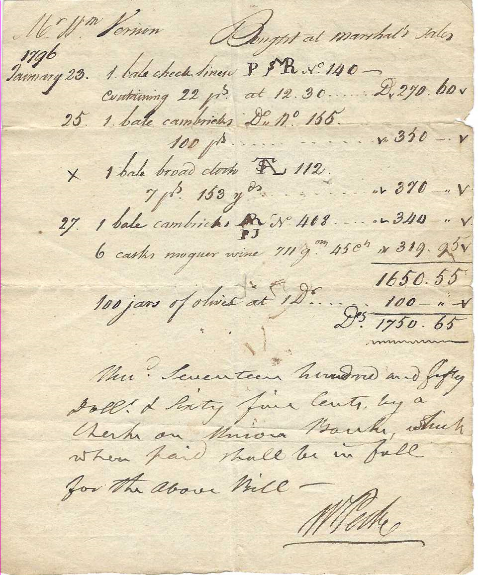 D19: 1791 June 23- Philadelphia, E. Dutilh & Wachsmuth Reciept 3 3/4" x 7 1/4" to John Mackinzie-Ship Journal for 2 1/2 days work on the Sloop Charming Sally, Capt. (Master) Robert Lillibrige. These two prominent merchants in Philadelphia in post-Revolutionary generation were Etienne, later Stephen Dutilh and John Godfried Wachsmuth. Dutilh came from a family of merchants branching through England, Holland, the West Indies, and around southern Europe. Dutilh travelled to keep the European parts of their trading empire together, E. Wachsmuch firmly planted ties in America. They had correspondence to merchants in many countries throughout the Atlantic side of the world who traded in coffee, indigo, flour, cotton wool, silk, logwood, butter, lard, glassware, china, drugs, and implements; There are historic records invoices to and from Bordeaux, Hamburg, Nantes, Rotterdam, Lisbon, London, Port-au-Prince, and other ports regarding trade in cheese, coffee, wine, glassware, hides, earthenware, and other dry goods, plus sugar, indigo, and rice from southern and Caribbean ports. This document is loaded with history of old Philly!--$48