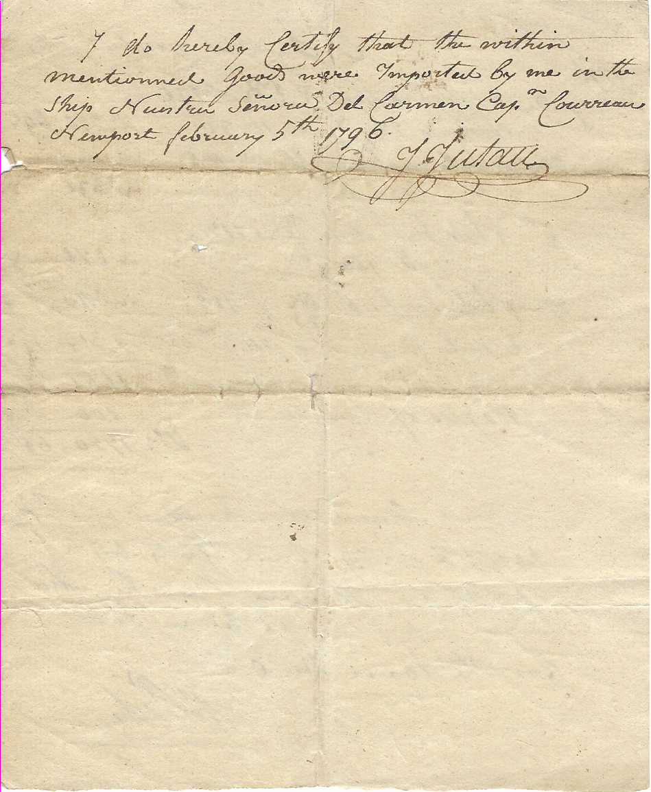 D17: 1796 ship Nuestra Senora del Carmen Spanish Schooner brings olives and wine to Newport, RI with the rest of this cargo. I had been looking around the net about this ship from Spain and do believe I found out what it was with this name. On 25 March 1815, HMS Comus 22 gun British warship ported at Duke Town/ Calabar now southern Nigeria, Africa( where she captured the Spanish schooner Nuestra Senora del Carmen with 120 slaves aboard.Took some time but this Schooner I do believe was the slave ship that dropped off olives back in Newport in 1796. Document in decent condition $285