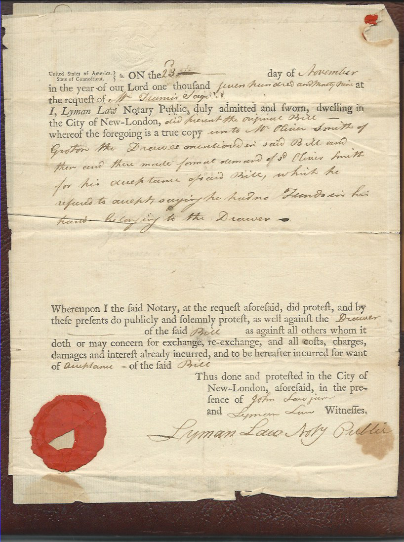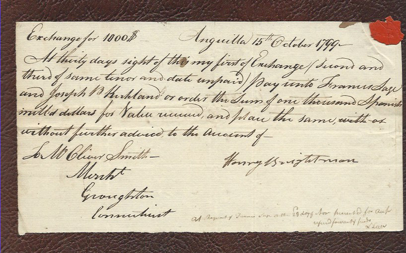 D37: 1799- 15 October, Here is a good one. Its a protest of 1000 Spanish milled dollars(Pieces of 8) dated in Anguilla. Early American Financial document. Anguilla is a British overseas territory in the Caribbean. It is one of the most northerly of the Leeward Islands in the Lesser Antilles. At 30 days sight of this my first exchange (second and third of same tenure and date unpaid) pay unto Francis Sage and Joseph P. Kirkland. L. M. Oliver Smith was a merchant that had dealings with this area in the West Indies in the Caribbean. There is quite a bit written on the inside of the document. This handwritten Exchange note is cool looking. Showing the old wax seals on the documents. The notary is Lyman Law.--$187