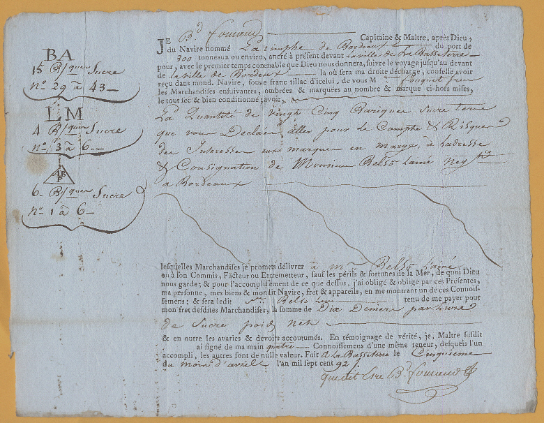 D40: 1792 Bill of lading from France, ship's name La Nymphe De Bordeaux. Cargo of sugar from the port of La Basse Terre, the Caribbean Island of Guadeloupe(French Antilles) to Bordeaux France. It is all written in French on old light blue paper. Marks and numbers are in left ara of the Bill of lading. This would frame nice. Endorsed on reverse with the year 1792 written. Size 7 1/2" x 9 3/4". The item is scanned below, price--$50