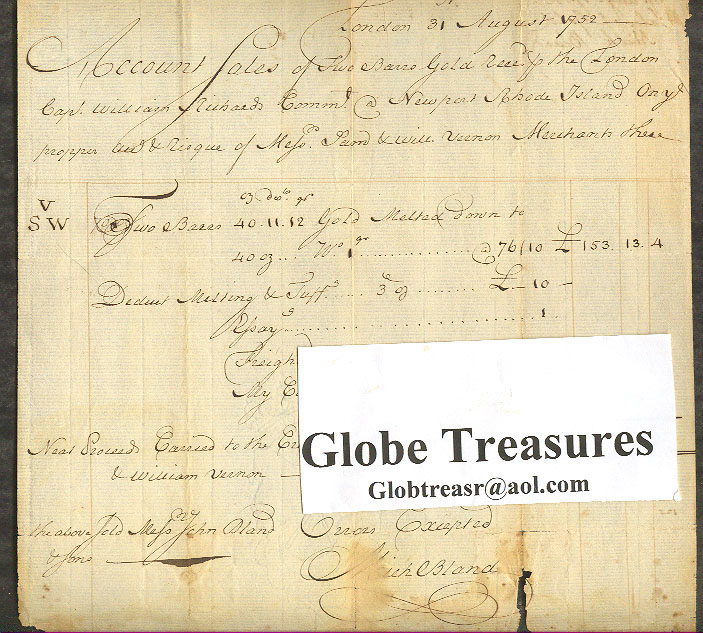 D6: 1752 London sales of 2 barrs of gold received from ship �The London� and Capt. William Richards. Gold barrs melted down to 40 oz. long document shows what Michael Bland received for his commission. folds open/ with slit. try and find a document like this anywhere at this price --$178