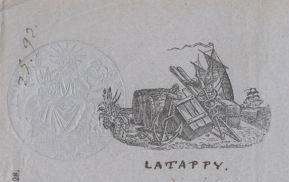 D24:1806 June 10 Liverpool-Owners of Brig. Hamilton to Richard Bawks. This paper shows a listing of materials and thimbles and gives the number of the type material to repair the sails, it mentions N6, 65 3/4 yards, N3, 22 yards, N4, 31/2 yards more N6, 131/4 yards, N7, 10 yards and others of 57 and 43 yards. The totals for these are listed in Pounds signed by Capt. Sam Harding. He was from the state of Maine and this is his ship trading in England. The paper has some bends and it has a small tear around 2/3 down on the lower right. I bought several of these papers on this Captain and his ship most are damaged in some way from improper storage. This paper is watermarked with a Crown over an oval with a lady seated with a trident in the center. It could possibly represent Britannia- 7 3/4X 8" ---$26